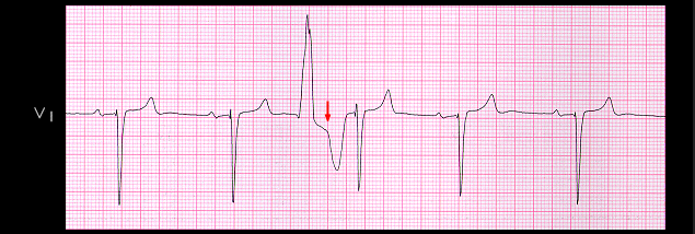 This tracing illustrates an interpolated ventricular premature beat. The sinus PP interval is 1.24 seconds (sinus rate 48) and the PR interval is 0.18 seconds. The ventricular premature beat is followed by a P wave that is difficult to see because it is contained within the ST segment and T wave of the premature beat (arrow) but it is still able to conduct to the ventricles, albeit with a prolonged PR interval (0.36 seconds).