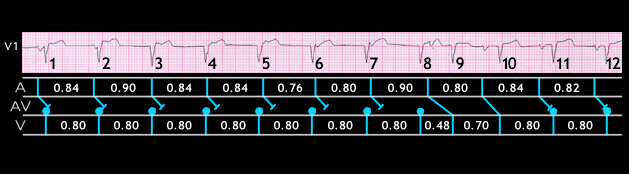 The ECG shown here is another example of this rhythm. The QRS complexes numbered 1-8 are the result of an accelerated junctional rhythm with a rate of 75 BPM (R - R interval = 0.8 seconds). The atrial rate is slightly slower, and the first 7 P waves do not conduct because the AV node is refractory, The 8th P wave occurs just after the 8th QRS complex. The AV junction has now partially recovered its ability to conduct and this P wave conducts to the ventricle with a prolonged PR interval (0.32 seconds) causing QRS complex #9. As a result the RR interval between QRS complexes #8 and 9 is only 0.48 seconds. The next P wave is also able to conduct to the ventricles, this time with a PR interval of 0.24 seconds, causing QRS complex #10. The last 2 QRS complexes (#s 11 and 12) are again the result of the accelerated AV junctional rhythm.
