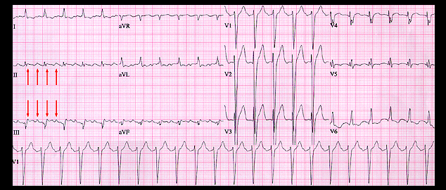 The narrow complex tachycardia is regular with a rate of 140. The correct diagnosis is atrial flutter with 2:1 AV block. The tracing points out the importance of always considering this diagnosis when the ventricular rate is regular and in the range of 130-160 (the rule of 150). Often, as in this tracing, it is difficult to see both flutter waves because one may be buried in the T wave. However, careful scrutiny of the tracing will invariably show at least one lead in which both flutter waves can be identified. In this tracing, the flutter waves are seen best in leads II and III (red arrows)