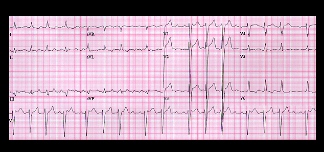 This ECG is from the same patient. It was recorded a few minute later during gentle carotid sinus massage and now there is variable AV block. Note that the flutter waves are much easier to identify when there is 3:1 and 4:1AV block than when there is 2:1 block. The use of carotid sinus massage to increase AV block is an important diagnostic and therapeutic maneuver in patients with rapid supraventricular tachycardias.